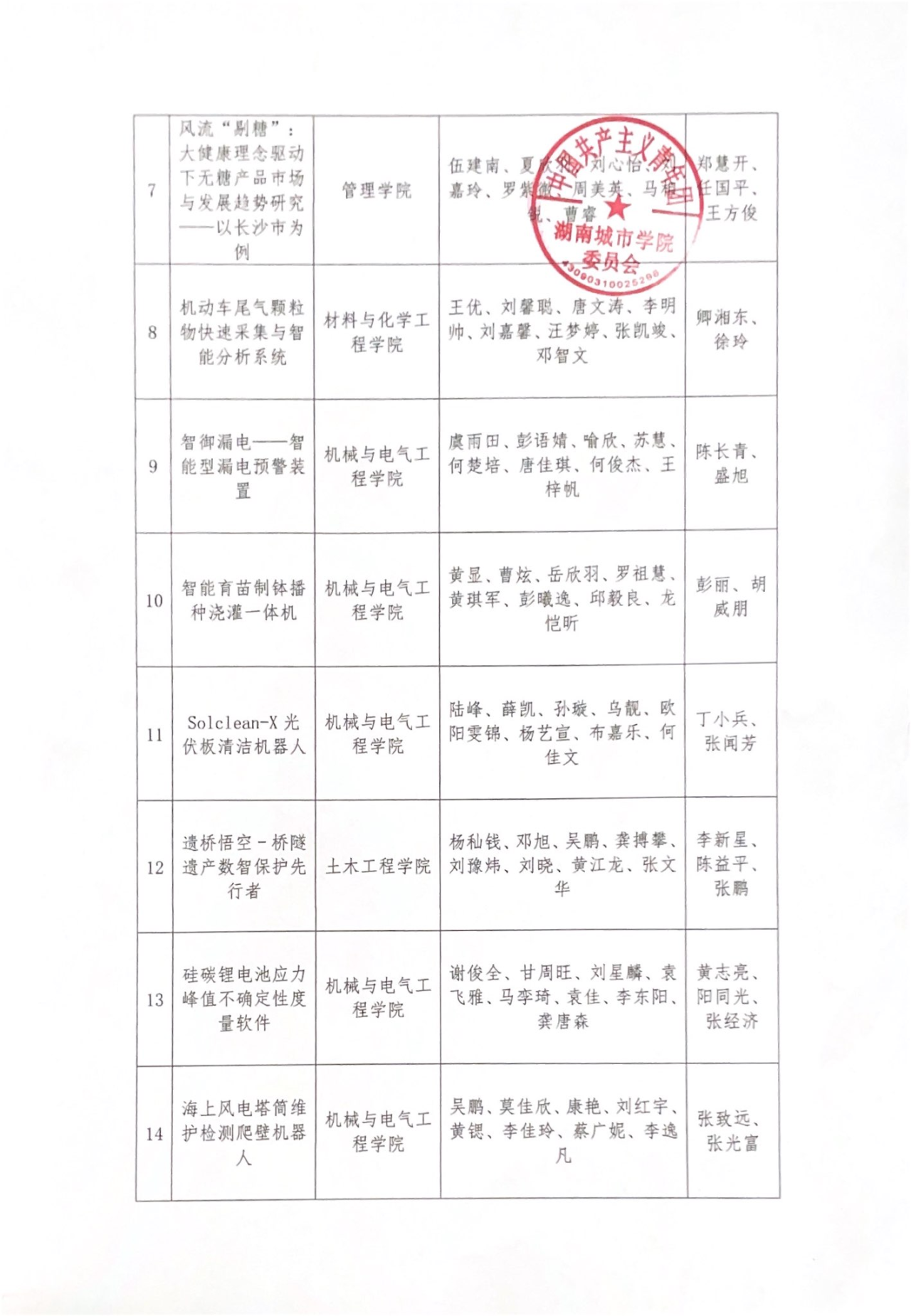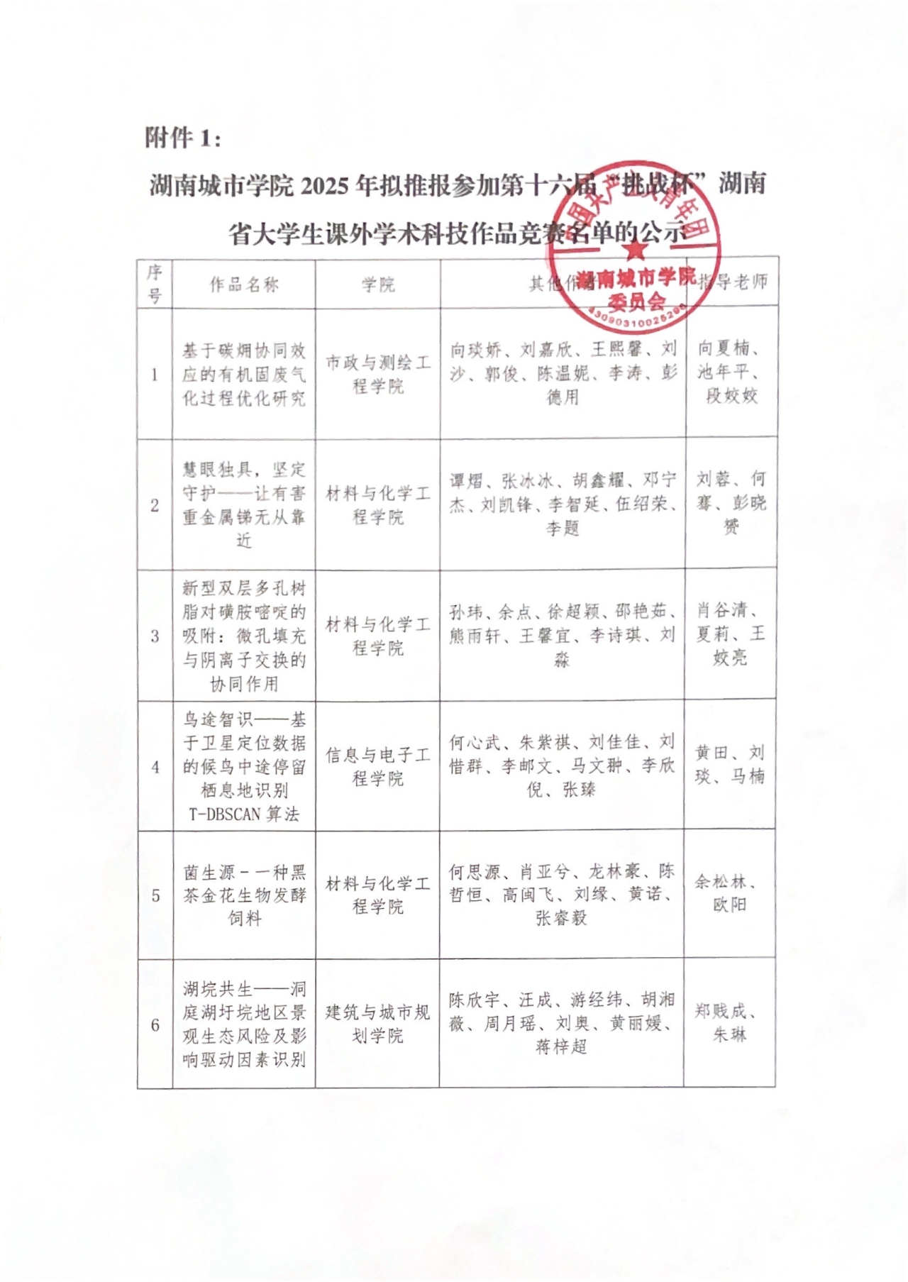 根据《关于组织开展第十六届“挑战杯”湖南省大学生课外学术科技作品竞赛的预通知》文件精神及相关要求,经学院初评、形式审查、重复率审核、通讯评审、现场答辩、校外函评等环节,综合评审结果,拟推荐以下14件作品参加省赛。现将作品名单予以公示(详见附件)。