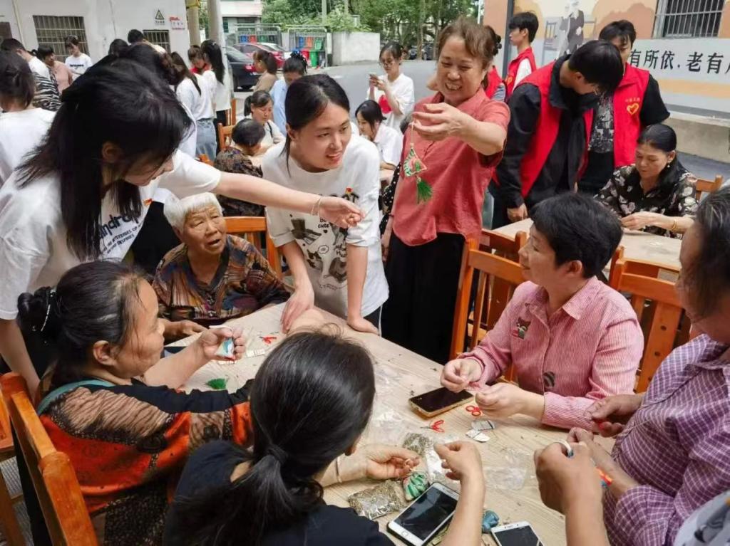 包粽子的同时,制香囊也紧锣密鼓地展开着。在工作人员的指导下,学生团员一针一线将艾草、青蒿等草药装进香包缝制香囊,针脚虽然歪歪扭扭,却也做得像模像样……经过一个小时的努力,一个个香气宜人的香囊在大家的巧手中诞生。随后,学生团员纷纷将自己制作的香囊送给社区高龄老人,让更多老人感受浓浓端午情。