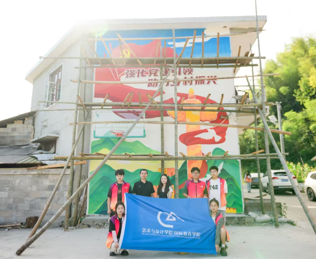 新湾镇的延续:2023年7月,他们前往沅江市新湾镇,开展为期一周的乡村墙绘公益实践活动。在当地干部的协助与杨文副教授的悉心指导下,他们对设计稿多次修改后精心创作墙景,呈现出能够展现社会主义新农村风貌的墙绘作品。