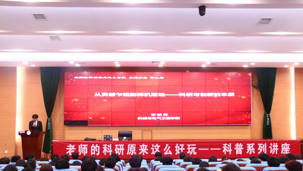 本次讲座于2024年4月19日晚上19:00在图书馆报告厅举行。我校机电院教师,机械工程专业博士李航洋老师担任此次讲座的主讲老师,报告主题为“从灵感乍现到样机落地——科研与创新的本质”。