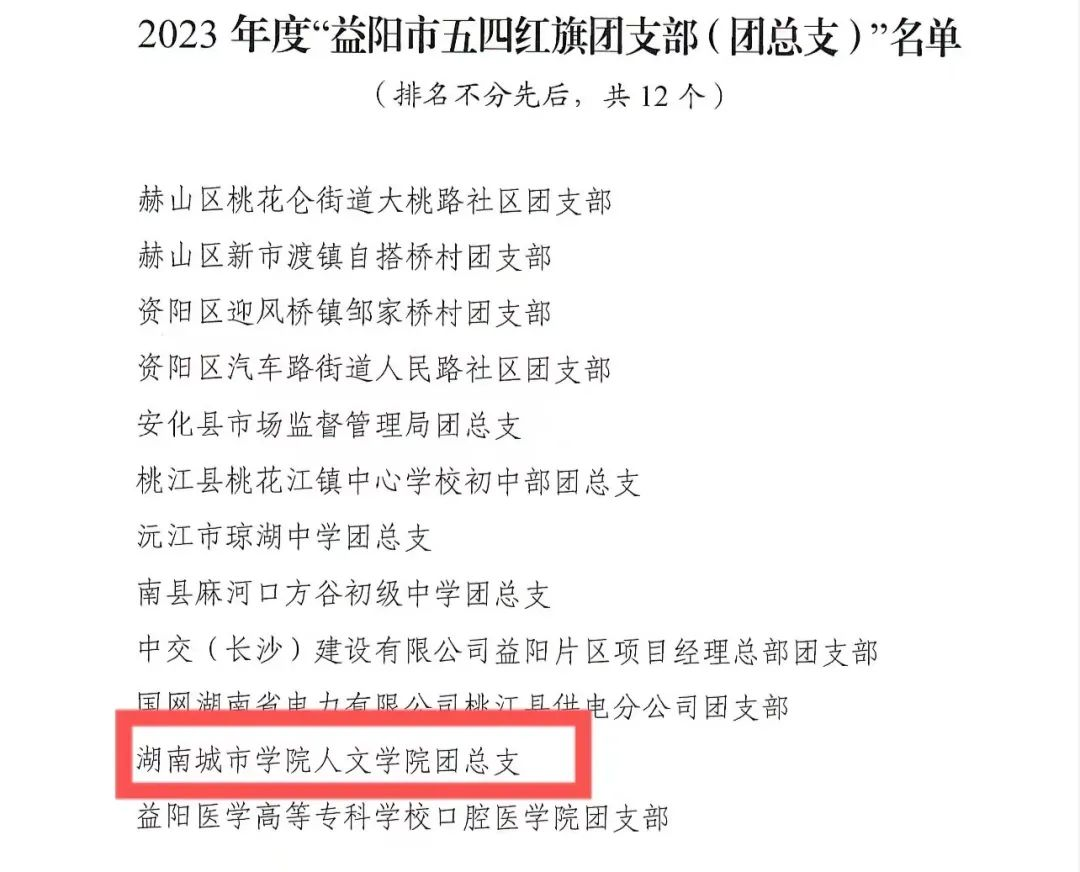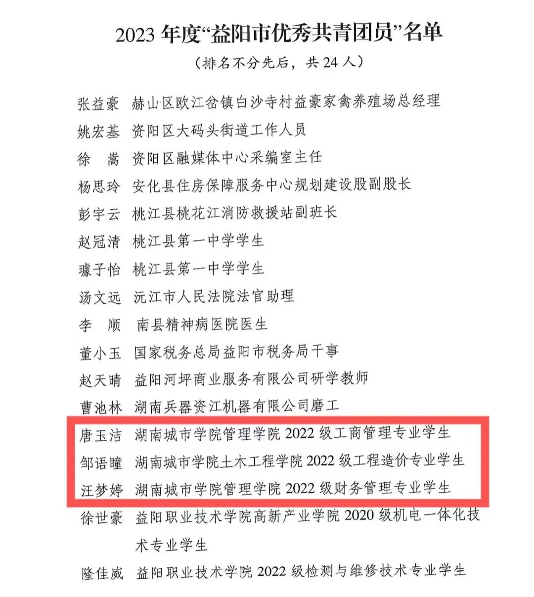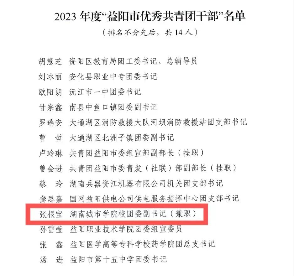 为全面贯彻落实党的二十大精神,充分发挥青年典型模范带头作用,进一步激励全市广大团员青年、团干部和基层团组织更加奋发有为、再创佳绩。6月19日,共青团益阳市委办公室发布《共青团益阳市委关于评选2024年“益阳青年五四奖章”结果的通报》、《共青团益阳市委关于评选2023年度“益阳市优秀共青团员”“益阳市优秀共青团干部”“益阳市五四红旗团委(团工委)”“益阳市五四红旗团支部(团总支)”结果的通报》,我校一批个人和集体喜获表彰。