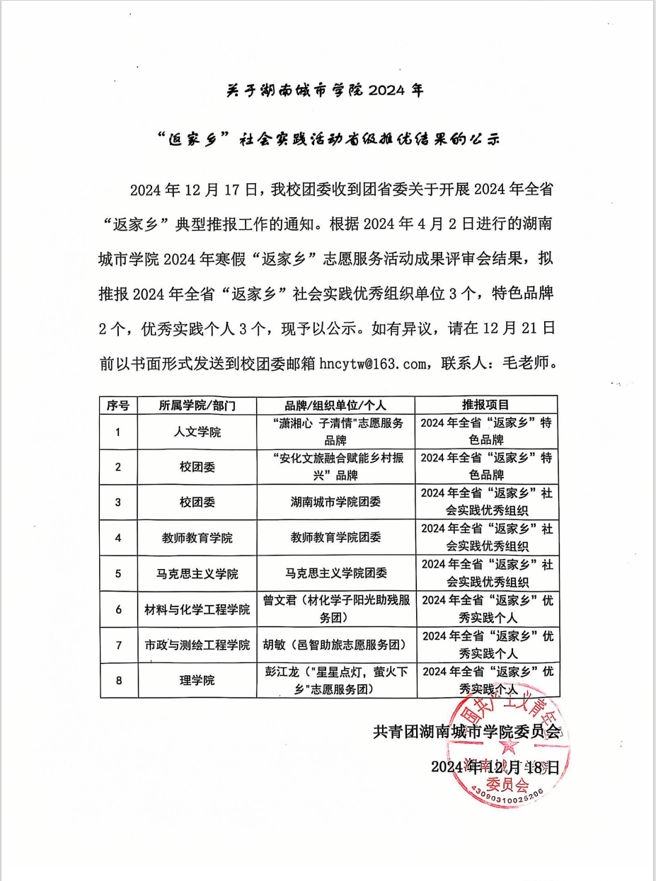 关于76net必赢线路检测中心2024年 “返家乡”社会实践活动省级推优结果的公示