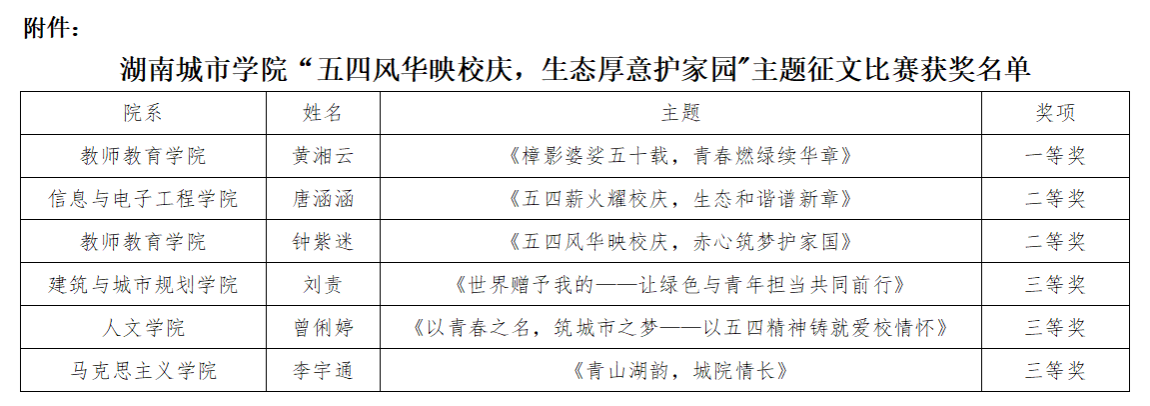 为传承五四精神,加强对爱国如家、爱校荣校、国家安全、生态保护的深刻认知,校团委学生会学风建设部举办的“五四风华映校庆,生态厚意护家园”征文比赛顺利落下帷幕,经过评委会对参赛作品的认真审阅和综合评定,现将获选名单公布如下: